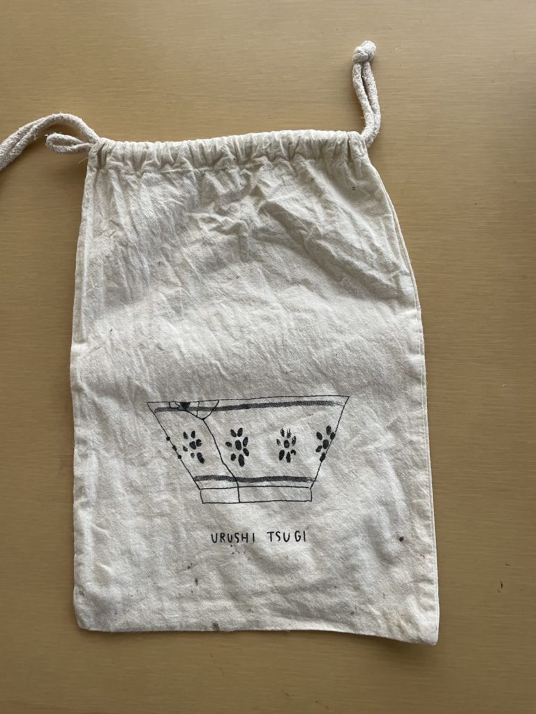 この教室の大きなポイントはオリジナルの道具袋付きなこと。ほんとかわいい。私はね、テキストもロゴマークもかわいい、サイトもかわいい、いろんなものをかわいいで固めているんですよ。画像は私の使ってるものなので、ちょっとあちこち漆が付いてますけど。ね、かわいいでしょ。道具とテキストがまとめて入ります。